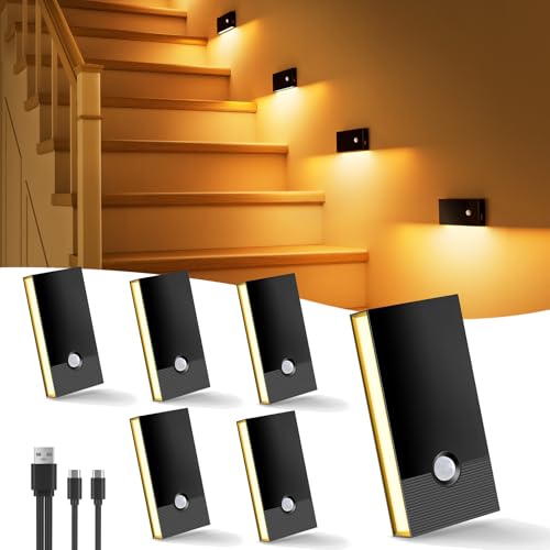 Swoieltr Veilleuse detecteur de mouvement, Lot De 6 Lampe Detecteur de mouvement interieur 2700K, USB Rechargeable Veilleuse à Induction pour Armoires, Chambres, Escaliers, Cuisines, Couloirs, Noir