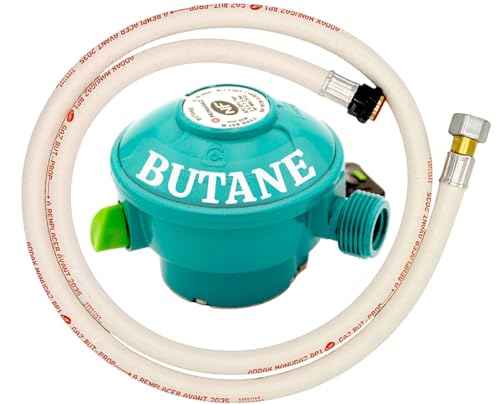 Générique Détendeur Quick-on Butane 28 mbar – Compatible Twiny (Primagaz), Elfi (Butagaz), Malice & Calypso (Antargaz) – Non Compatible Cube/Viséo/Propane (Détendeur + Flexible à vis, 2, Kit)