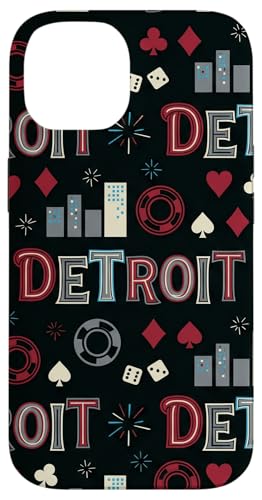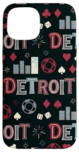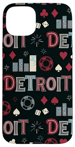 Illustration de répétition Fluide des icônes de la soirée de Jeux du Casino Detroit Skyline Coque pour iPhone 15 Plus