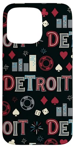 Illustration de répétition Fluide des icônes de la soirée de Jeux du Casino Detroit Skyline Coque pour iPhone 15 Pro Max