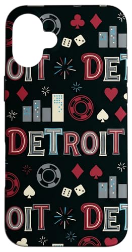Illustration de répétition Fluide des icônes de la soirée de Jeux du Casino Detroit Skyline Coque pour iPhone 16 Plus
