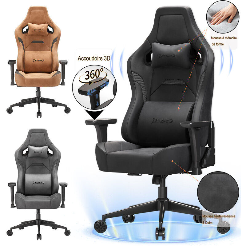 Devoko Chaise Gaming avec Design Ergonomique, Daim (Doux et Respirant), Appui-tête et Soutien Lombaire en Mousse Mémoire, Accoudoirs 3D, Dossier