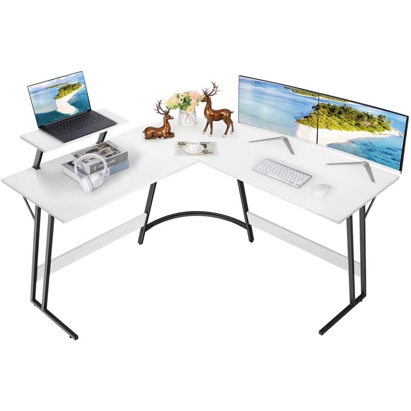 Devoko - Bureau d'angle Angle en forme de l avec support à deux couches acier ergonomique bois matériel blanc 130cm