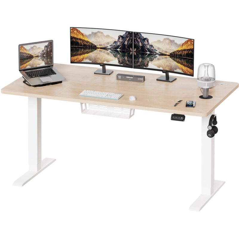 Devoko Bureau réglable en hauteur 140 x 60 cm avec prise USB, bureau électrique réglable en hauteur avec fonction mémoire, 73-118 cm, beige