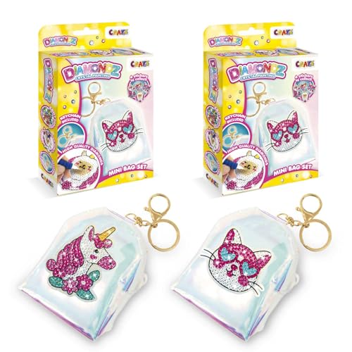 CRAZE DIAMONDZ Mini Sac Pack de 2 - Kit de Peinture Diamant pour Fille Motif CHAT & LICORNE, Mini Sac à Dos Porte-clés avec Autocollant Diamant à Faire soi-même pour Enfants