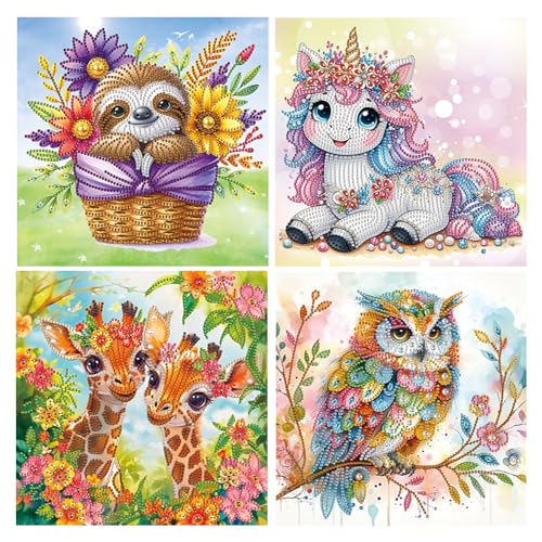 DCIDBEI 4 Pièces Diamant Peinture Strass Paillettes Spécial Paresseux 30x30cm Peinture par Numéros Girafe Diamond Painting Chouette et Hibou Broderie Diamant Paresseux Licorne sur Toile Débutants