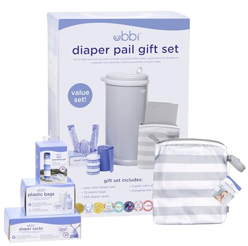 Ubbi Diaper Changing Value Set, Odor Locking Modern Design Baby Accessory Must Have Set Includes Grey Diaper Pail, Diaper Sacks, Odor Absorbing Gel, Travel Chaning Mat and Diaper Pail Waste Bags