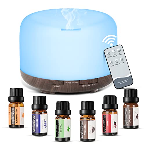 ACWOO Diffuseurs d'huiles Essentielles 500 ML avec 6 * 10ml Huiles Essentielles, Humidificateur Ultrasonique Diffuseur Aromathérapie, LED à 7 Couleurs, Arrêt Automatique, pour la Maison, Salon, Yoga