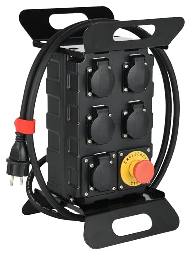 Electraline 60427 Coffret de Chantier 16A, 5 Prises Françaises IP44 16A, avec Disjoncteur Différentiel 30mA et Bouton Poussoir d'arrêt, Cable H07RN-F 3G2.5mm Longueur 2M