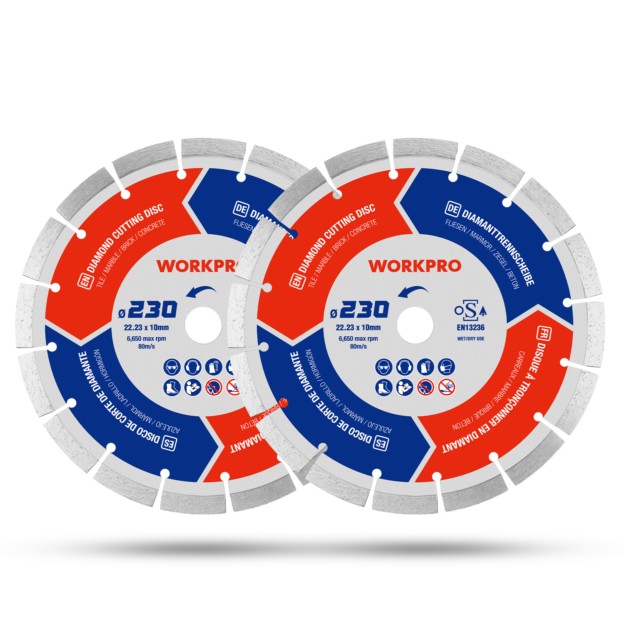 Disque a Tronconner Diamantes 230 mm WORKPRO, 2 Pieces pour Carrelage, Beton, Pierre, Brique, Granit, Marbre, Meuleuse