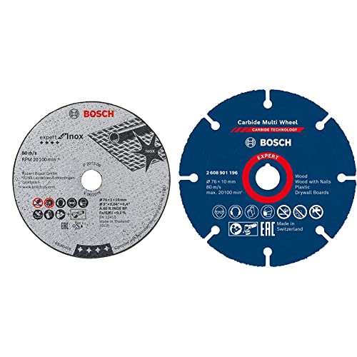 Bosch Accessories 5 disques à tronçonner Expert for Inox (pour acier inoxydable, 76 x 10 x 1 mm) & Bosch Professional 1x Disque à tronçonner Expert Carbide Multi Wheel (pour Bois dur, Ø 76 mm)