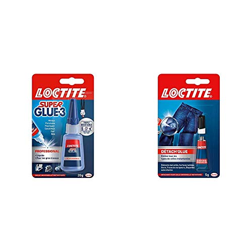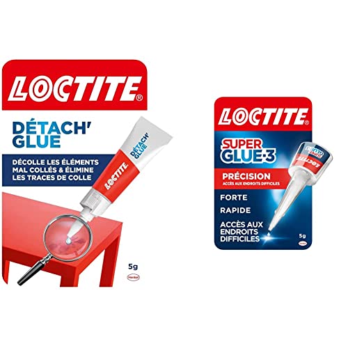 Lot de 2 produits Loctite - Détach'Glue, dissolvant colle qui enlève taches et résidus de colle cyanoacrylate, tube de 5 g & Super Glue-3 Précision, colle forte pour réparations précises, flacon 5 g