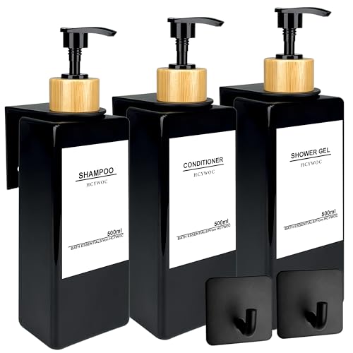 HCYWOC 3 Pièces Distributeur Savon Mural sans Percage, Distributeur de Savon Mural avec 32 Étiquettes Imperméables, 500ml Distributeur Gel Douche Mural, Distributeur Savon Salle de Bain, Noir Bambou