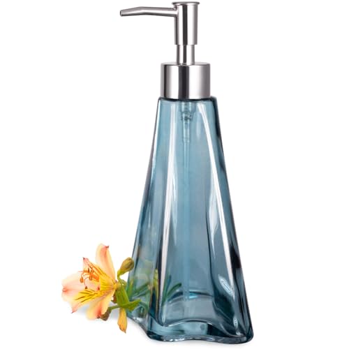 EMPO Distributeur de Savon en Verre Vintage élégant - Distributeur de Savon Liquide/Désinfectant/Shampooing avec Pompon, Décoration Rustique, Accessoires de Salle de Bain (Bleu Ondulé)