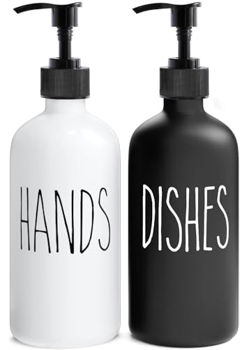 MOMEEMO Lot de 2 distributeurs de Savon à Vaisselle et Distributeur de Savon pour Les Mains - Distributeur de Savon en Verre avec Pompes en Plastique Noir - Blanc - 473 ML