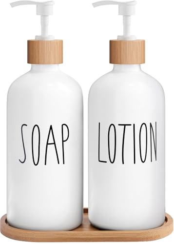 MOMEEMO Distributeur de Savon Blanc pour Salle de Bain avec Distributeur de Savon en Verre, Pompes et Plateau en Bambou pour décoration d'accessoires de Salle de Bain (Blanc)
