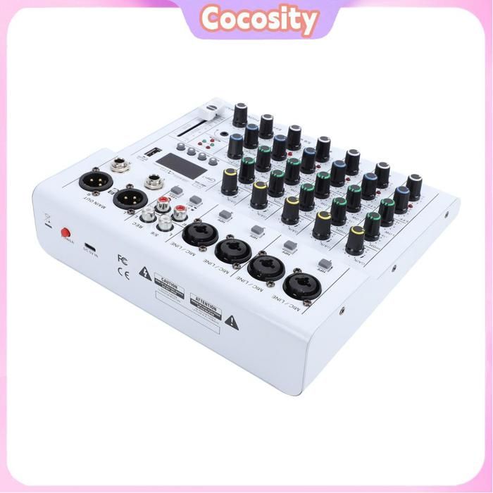 Cocosity Interface sonore mini mixeur Mini mélangeur de son 6 canaux contrôleur DJ avec lecteur MP3 BT musique accordeur Blanc