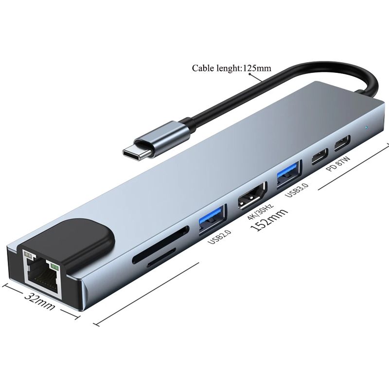 Hub USB C 8 en 1 type-c vers Multiports 4K RJ45 PD Charge lecteur de carte SD/TF Type C vers USB adaptateur Dock pour MacBook Air Pro PC - Type Grey