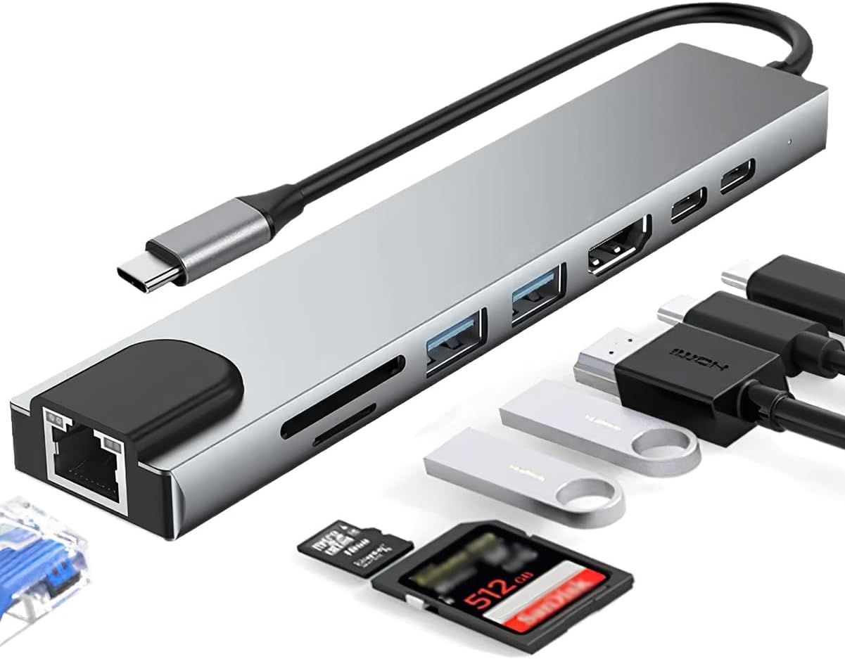 Hub USB C vers Ethernet, 8 en 1 Adaptateur USB C vers HDMI 4K, 100W PD, USB C 3.0, USB A 3.0, SD/TF Multiport Dock pour MacBook Pro Air M2 M1 Surface iPad Galaxy HP
