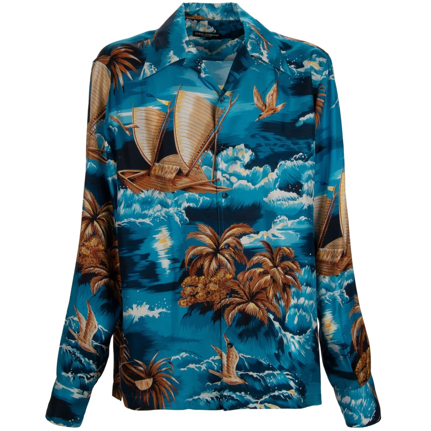 DOLCE & GABBANA Chemise En Soie Imprimé Palmiers Bleu À Manches Oversize