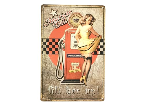 FÉENOMENN Plaque Métal Déco Vintage - PUB Pompe à Essence Pin up - American Doll (30x20cm)
