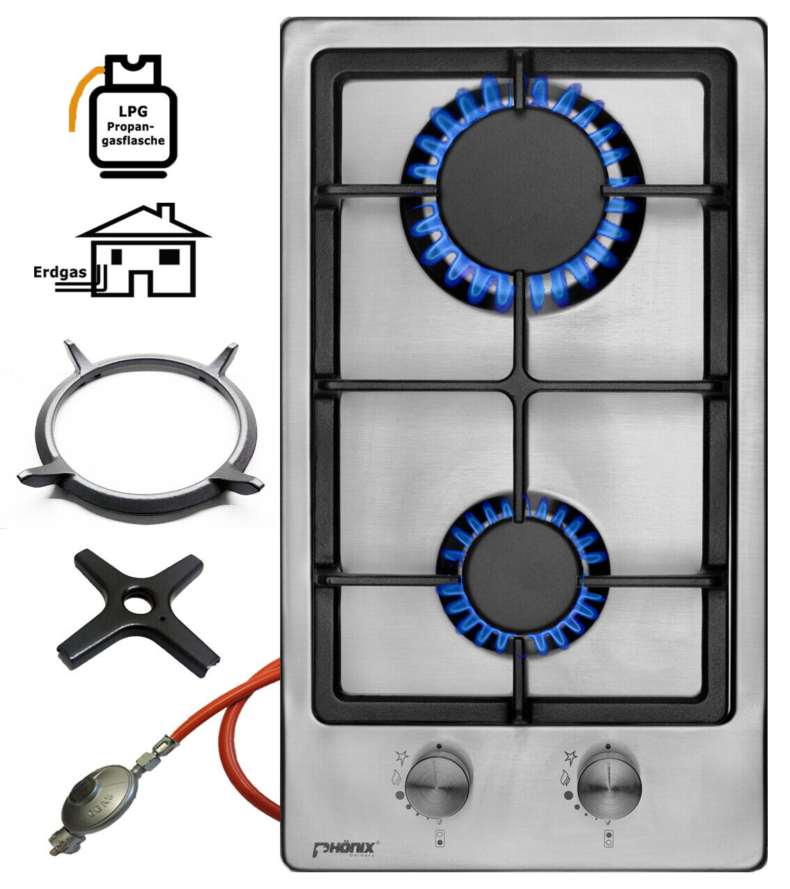 Phönix Domino gaz Plaque de verre Réchaud à gaz 2 feux, plateau de ponçage Embout + Cuisinière Croix Wok en fonte