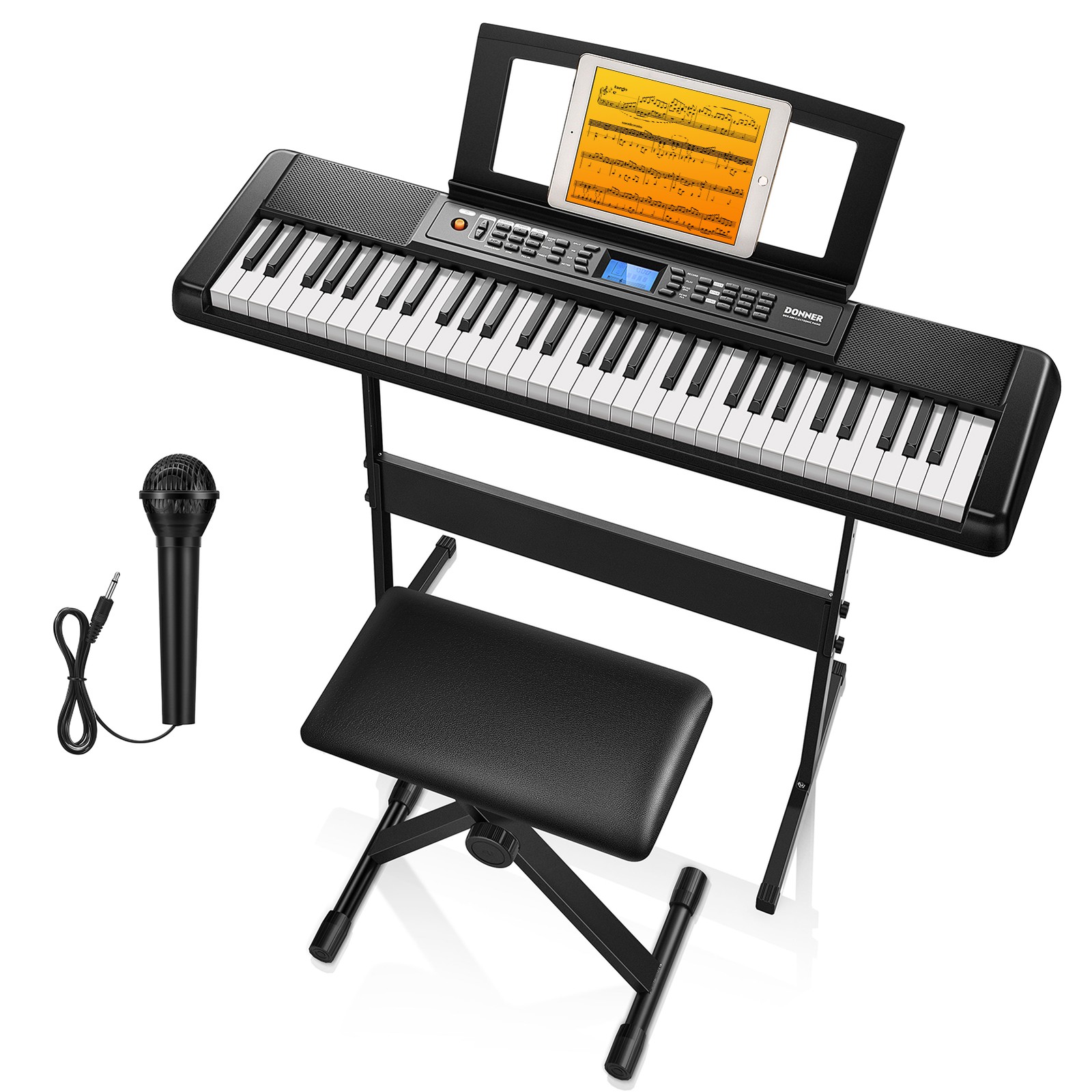 Donner Keyboard Piano 61 Key, Kit de clavier électrique avec 249 voix, 249 rythmes - Comprend un support de piano, un tabouret, un microphone, Cadeau pour les débutants, Noir(DEK-610S)