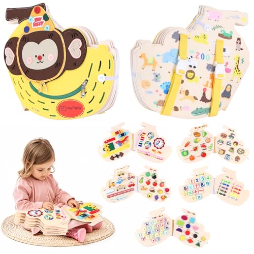 Heypappy Busy Board,12 en 1 Jeux Montessori Éducatif Jouets Sensoriels d'apprentissage de Livre d'Activités pour Tout-Petits avec Motricité Fine,Jouets de Livre avec Bretelles de Sac à Dos (Singe)