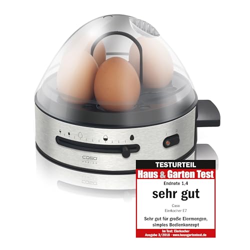 CASO E 7 – Cuiseur à œufs électronique pour jusqu'à 7 œufs, support d'œufs amovible, signal acoustique, 13 niveaux de cuisson, sans BPA, avec gobelet doseur et picker, 14 cm l x 18 cm l x 20,5 cm h