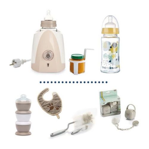 Chauffe biberon + Biberon verre 230ml + Goupillon biberon + Boîte doseuse de lait + Bavoir + Coffret Boîte a sucettes