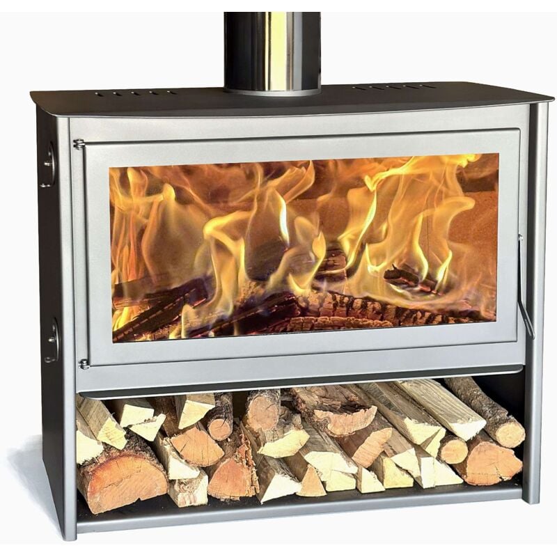 Poêle à bois 12.0 kW avec four – Revêtement métallique gris – Chambre de combustion avec pierres réfractaires – Bac à cendres amovible