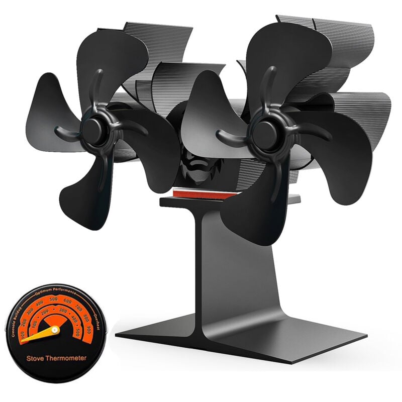 Ventilateur thermique à double moteur Heat pour poêle à bois, à gaz ou à granulés, avec thermomètre magnétique intégré, noir. Compatible avec les