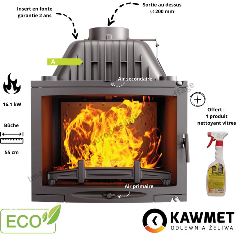 Insert cheminée à bois en fonte 16.1 kW – Double combustion – Vitre panoramique – Pour bois dur jusqu'à 20% d'humidité – Sortie de fumée 200 mm
