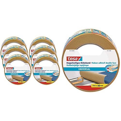 Tesa Ruban Adhésif Double Face Universel - Ruban Adhésif Polyvalent - Lot de 6 rouleaux 10 m x 50 mm & Universal Rouleau de Ruban Adhésif Double Face pour Surfaces Lisses- 25 mm x 50 mm