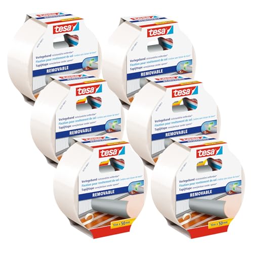 tesa Ruban Adhésif pour Sols sans Traces - Ruban Adhésif Double Face pour Tapis, Sols en PVC et Moquettes - Adhésif Renforcé en Textile, 10 m x 50 mm - Lot de 6