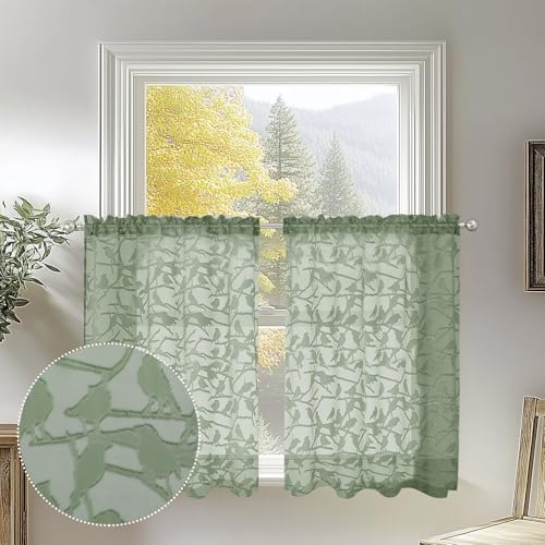 OVZME Anji Lot de 2 Rideaux Transparents texturés Vert Sauge de 91,4 cm de Long pour Petites fenêtres, Salle de Bain, café, Salon, Double Passe-Tringle, 96,5 x 91,4 cm (l x L)