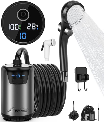 WADEO Douche de Camping Portable, Affichage Numérique Intelligent, Débit 11.1L/Min, IPX7, 8000 mAh Haute autonomie (175 Min), pour Randonnée, Voiture, Bain Animaux (Gris Argenté)