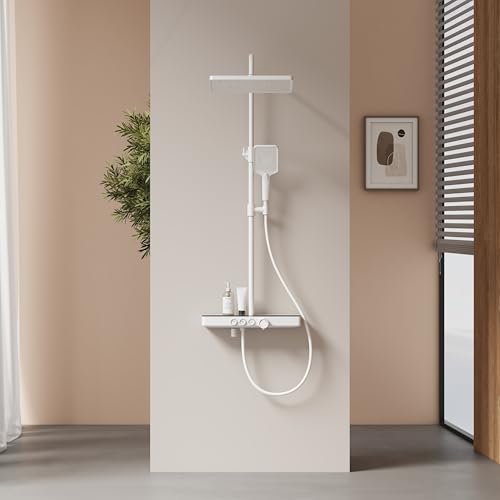 EMKE Colonne de douche thermostatique, douche de pluie et douche manuelle, hauteur réglable 816-1146 mm, blanc mat, set de douche avec étagère en verre, 1146 x 450 x 480 mm