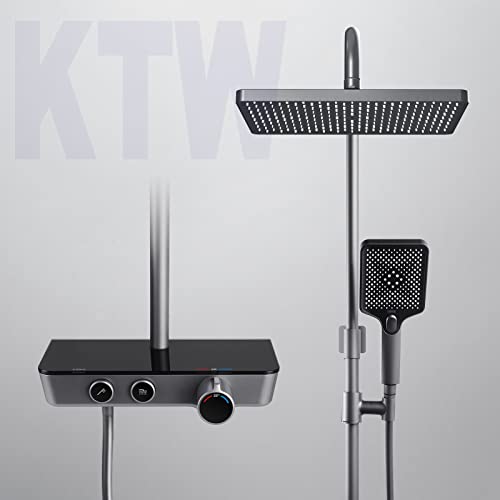 EMKE Colonne de douche thermostatique, douche à 3 niveaux avec jet en cascade, ensemble de colonnes de douche, ensemble de douche avec étagère en verre, certification KTW,Anthracite mat