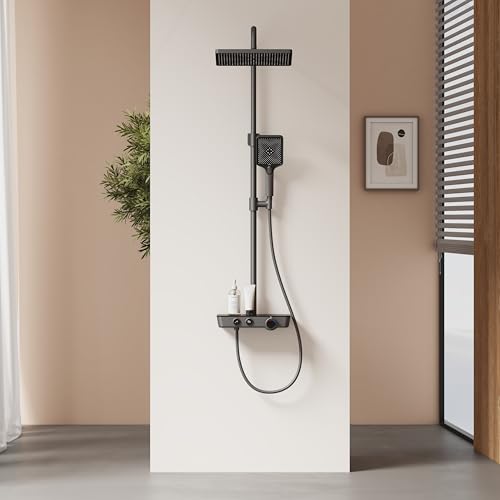 EMKE Colonne de douche thermostatique avec douche de pluie et douche manuelle, 1142 x 303 x 460 mm, anthracite mat, set de douche avec étagère en verre, hauteur réglable 812-1142 mm, fonction 3 en 1