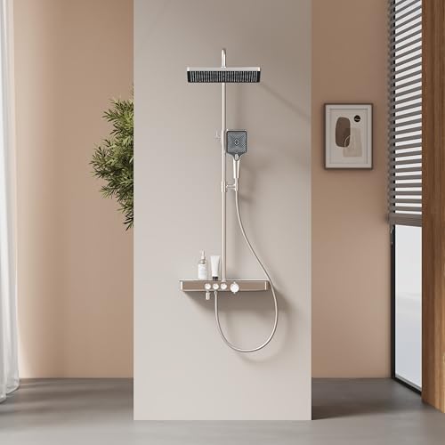EMKE Colonne de douche thermostat, étagères en verre 36 x 14 cm, douchette, 3 types de jet, douche à effet pluie, bouche de distribution, montage mural, certification KTW, chrome