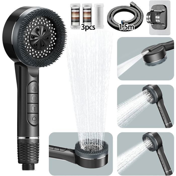 Pommeau Douche Haute PressionPommeau de Douche Filtre Anti-Calcaire à Cartouche Remplaçable avec 4 Modes de JetsTuyau Douche 1.5m