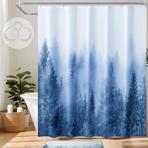 ORTIGIA Rideau de Douche Bleu forêt brumeuse, Rideau de Douche Nature Montagne, Rideau de Douche forestier, Rideau de Bain Fantaisie pour Salle de Bain, Tissu Polyester imperméable, 183 x 183 cm (l x