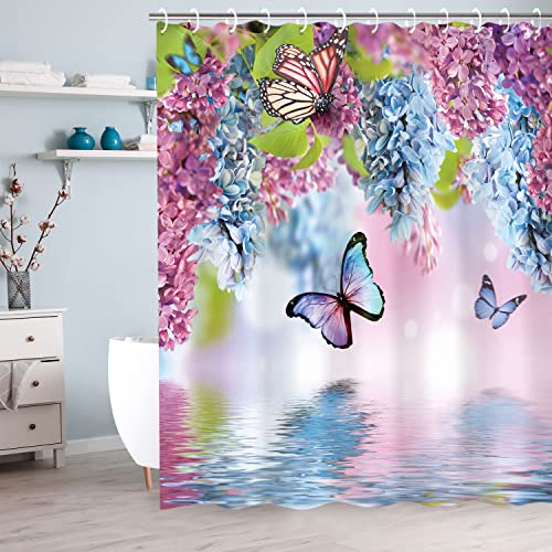 LIVILAN Rideau de douche papillon avec crochets, rideau de douche floral, rideau de douche papillon bleu, motif fleurs aquarelles et feuilles vertes pour décoration de salle de bain (183 x 183 cm (l x