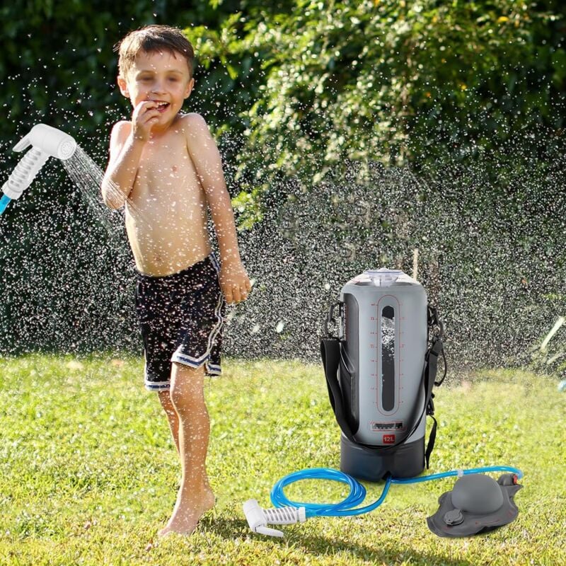 JDBDU Douche de camping avec pompe, 12 l/3 gallons, douche extérieure portable, tuyau de 1,9 m, pompe solaire, bidon d'eau pour le camping et les voyages