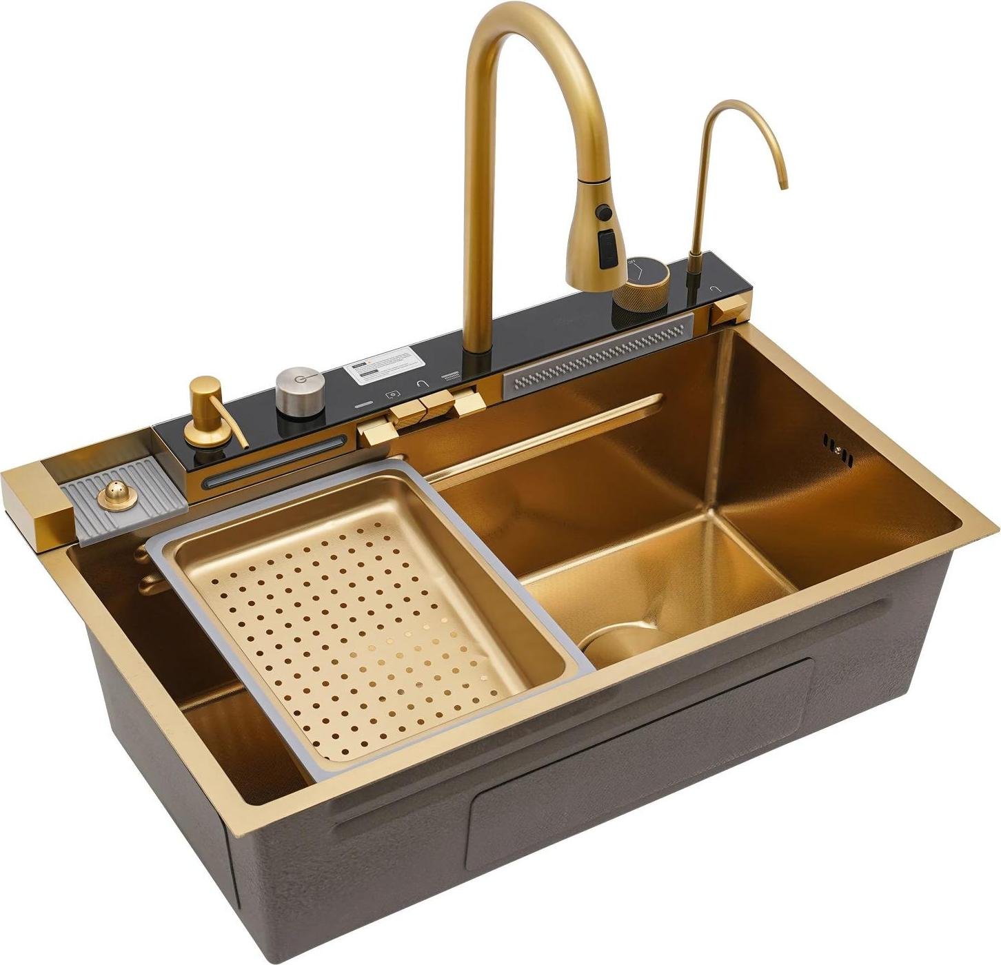 Ensemble d'évier de cuisine avec affichage numérique - Cuve simple 75 × 46 × 22 cm - Robinetterie cascade - Douchette extractible 60 cm - Raccord 1,27 cm - 1 trou - Acier inoxydable - Or