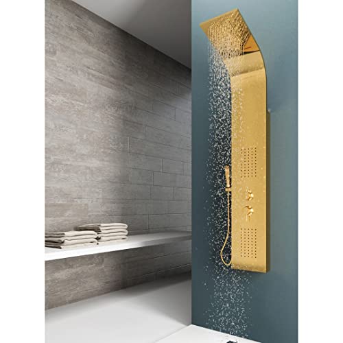 EM Colonne De Douche Jungle Or Acier Or Brillant Mat 4 Fonctions Avec Cascade Douchette Mélangeur D'eau Chaude Froide