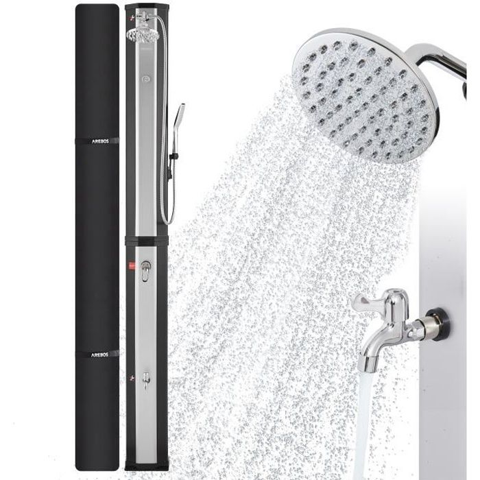 AREBOS Douche Solaire 60 L | avec douchette & thermomètre | Température de l'eau jusqu'à 60°C Douche Piscine Camping | Pommeau de Douche Rond | Technologie Snap-in | Couverture Incluse | Noir-argenté