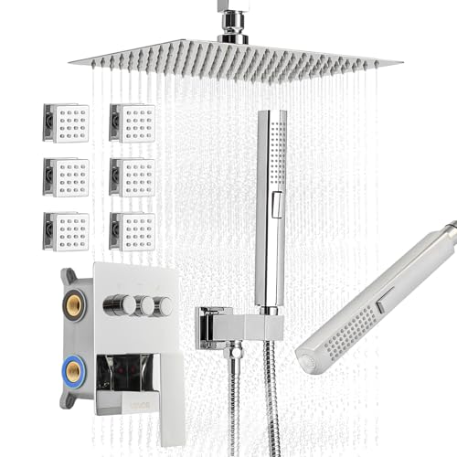 VEVOR Ensemble de Robinetterie de Douche, Système de Douche 3 Fonctions, Pommeau Haut à Effet Pluie 25,4 cm, 6 Jets de Corps et Douchette à Main, Kit Complet de Valve en Laiton et Garniture, Chromé