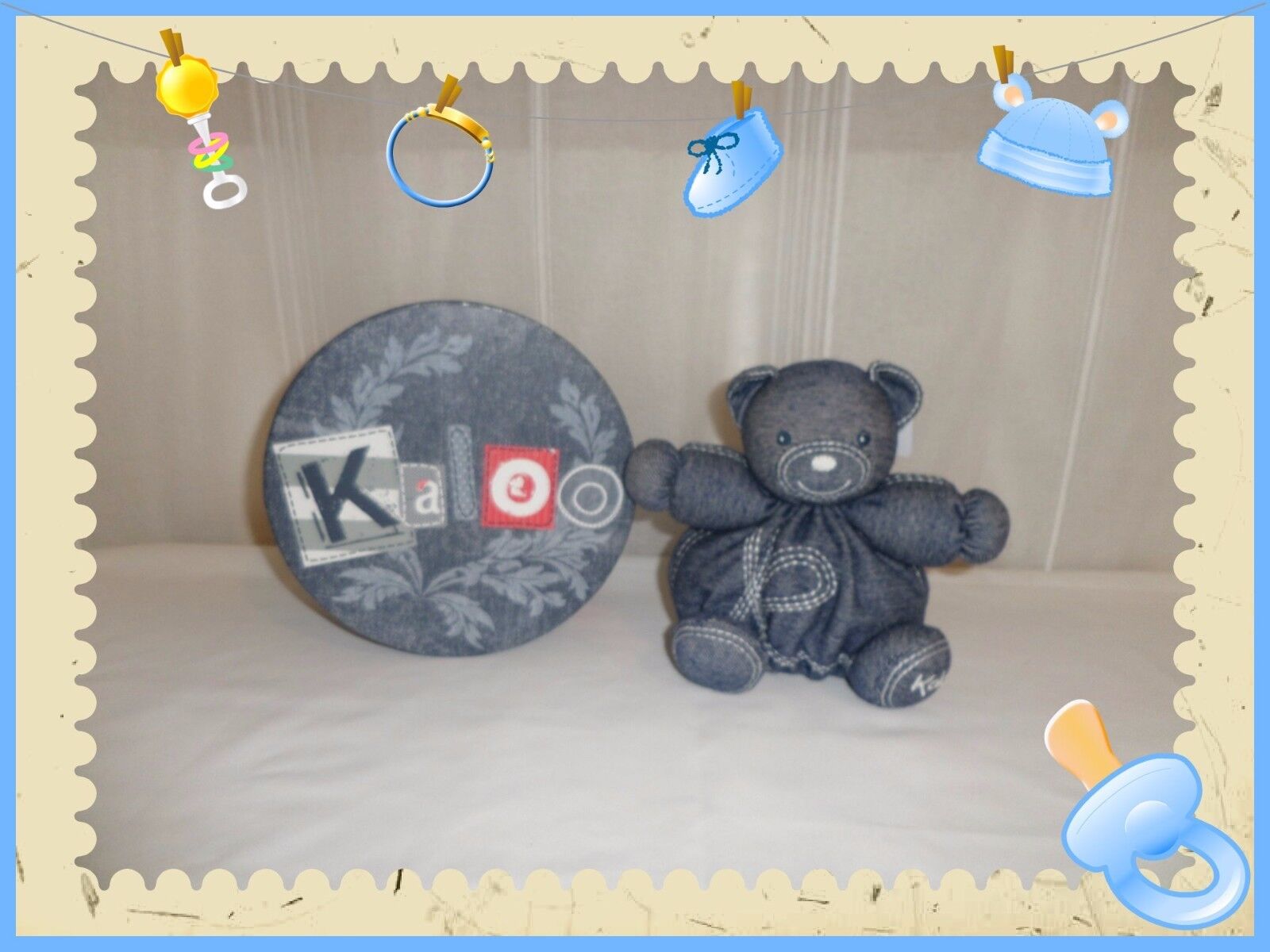 W9. DOUDOU PELUCHE BOULE KALOO OURS PERLE BLEU GRIS K BRANCHE 18cm NEUF + BOITE